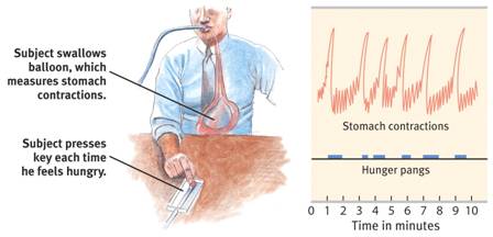The role of stomach contractions was investigated. Is hunger the result of the pangs of an empty stomach? Washburn and Cannon (1912) did research where the subject swallowed a ballon that measured stomach contractions. While being monitored, he pressed a key each time he felt hungry. The discovery: There were stomach contractions whenever he felt hungry. (Note: some diet aids try to reduce the feeling of an empty stomach by filling it with indigestible fibers that absorb water or eating high volume of low calories food and limiting other intake. With gastric bypass surgery, the smaller remaining stomach produces less ghrelin – see below.)