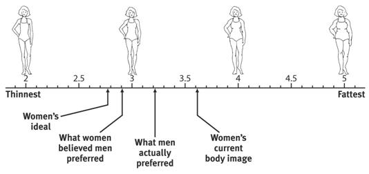 Fallon and Rozin (1985) in a study of 500 university women found that not only that women’s “ideal body weight” was less than their current weight, but that the weight that they thought men preferred was less than the weight men actually preferred.