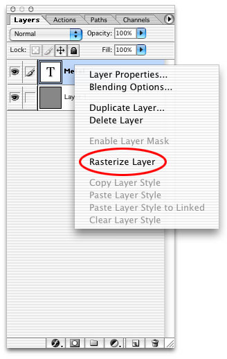 Then Right Click (PC) or Cmd+Click (Mac) on your type layer and select "Rasterize Layer" from the flyout menu. |